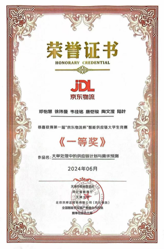 物流与供应链管理系学生邓怡慧、徐玮曼、韦佳铭、唐恺骏、陶文滢、陆叶组成的“数据别和我们作队”团队的作品《大单处理中的供应链计划与需求预测》在激烈竞争中脱颖而出,荣获全国一等奖!