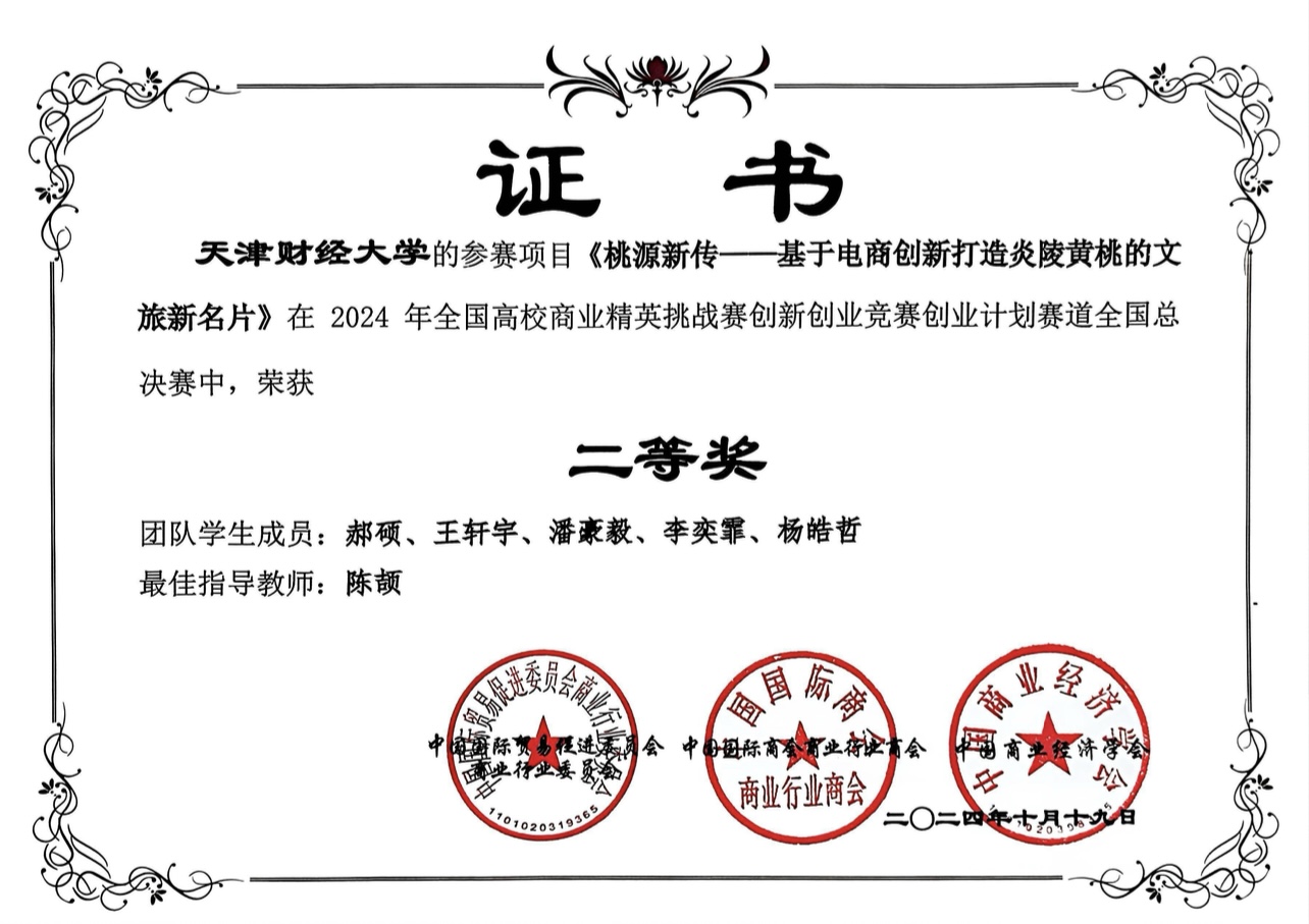 学生李奕霏组成的团队在陈颉老师的指导下,凭借参赛作品《桃源新传——基于电商创新打造炎陵黄桃的文旅新名片》在全国众多优秀团队中脱颖而出,荣获全国总决赛二等奖。指导老师陈颉获“最佳指导教师”称号。