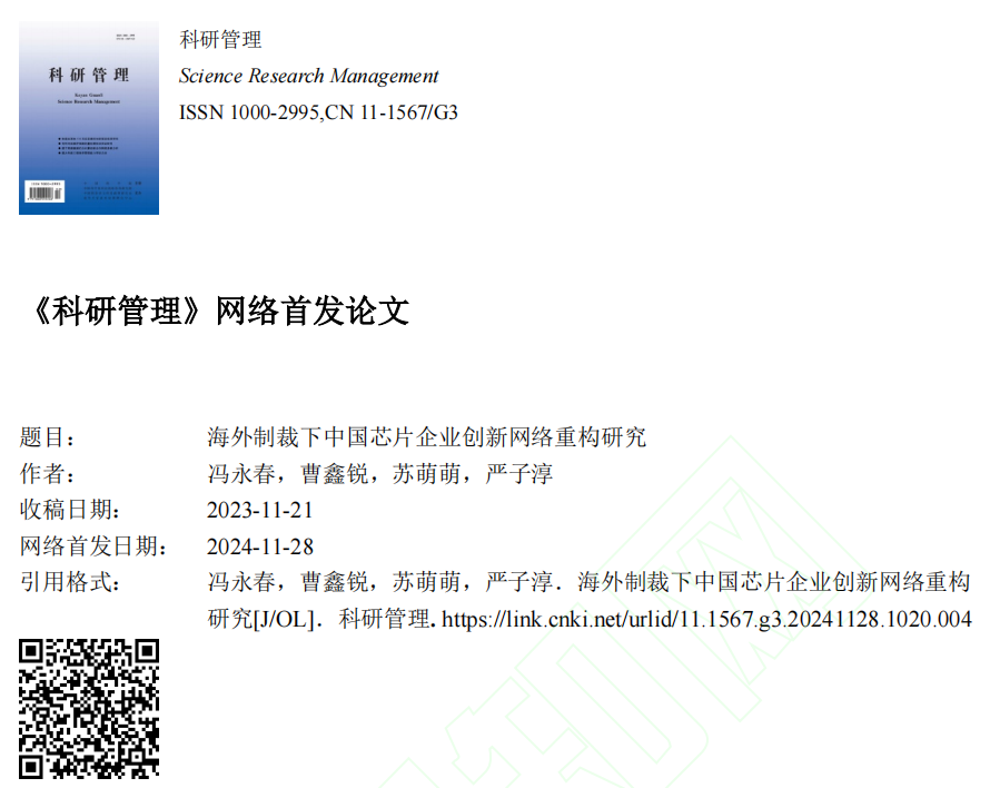 企业管理系冯永春副教授团队在国内高水平期刊《科研管理》网络首发学术论文“海外制裁下中国芯片企业创新网络重构研究”。